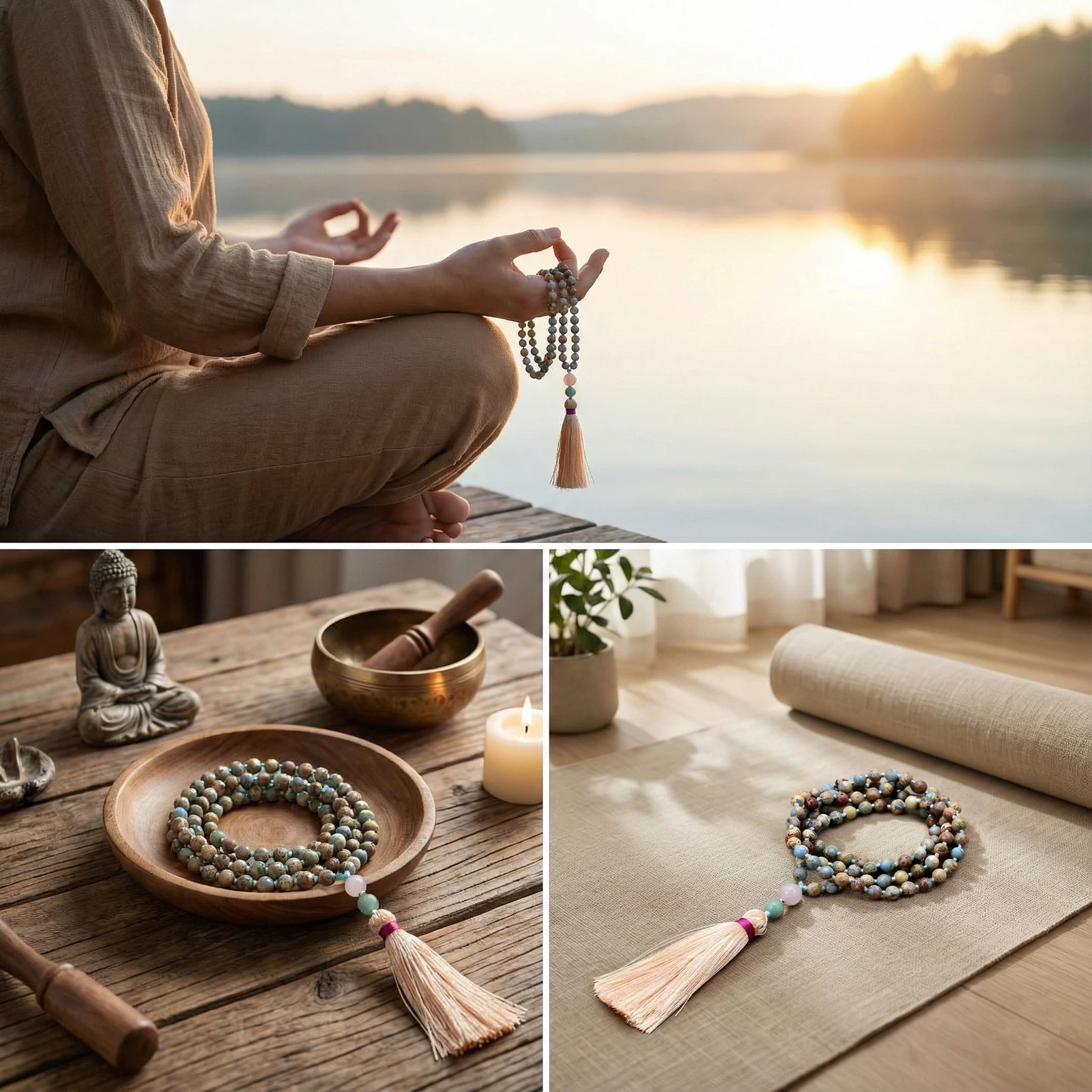 Collier Mala 108 perles en pierres précieuses : Jaspe Aqua Terra, Amazonite & Quartz Rose