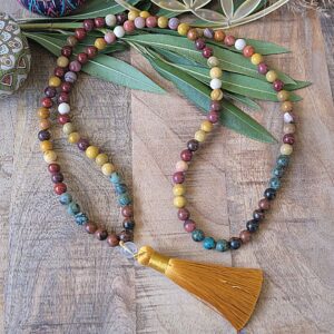 Épanouissez-vous avec un Collier Mala en Obsidienne, Turquoise & Mokaïte Adoptez ce joli Mala « Épanouissement », un chef-d’œuvre artisanal délicatement assemblé avec des perles naturelles de Mokaïte, de Turquoise Africaine et d’Obsidienne Acajou de haute qualité. Une véritable touche de zen pour votre cou. Idéal pour les adeptes de Yoga et de méditation, ce collier Mala…