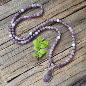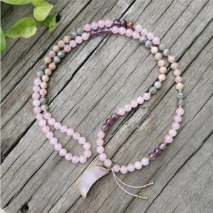 Collier Mala ‘Lune Rose’ en Pierres Précieuses – Énergie, Amour & Transformation Découvrez la beauté intemporelle du collier Mala « Lune Rose », un bijou unique conçu avec une longueur généreuse pour un confort optimal. Offrant à la fois de la paix, de l’amour et de la force, ce collier spécial est orné d’un pendentif Lune paré…