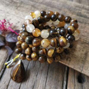• Collier Mala "Bulle de Protection" en Quartz Fumé, Quartz de Feu & Oeil de Tigre